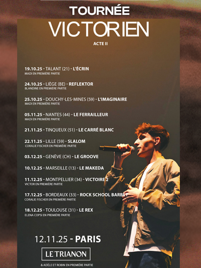 Révélé dans la « Star Academy », Victorien poursuit son ascension avec une tournée à travers la France, la Belgique et la Suisse, portée par le succès de sa musique sincère et universelle.